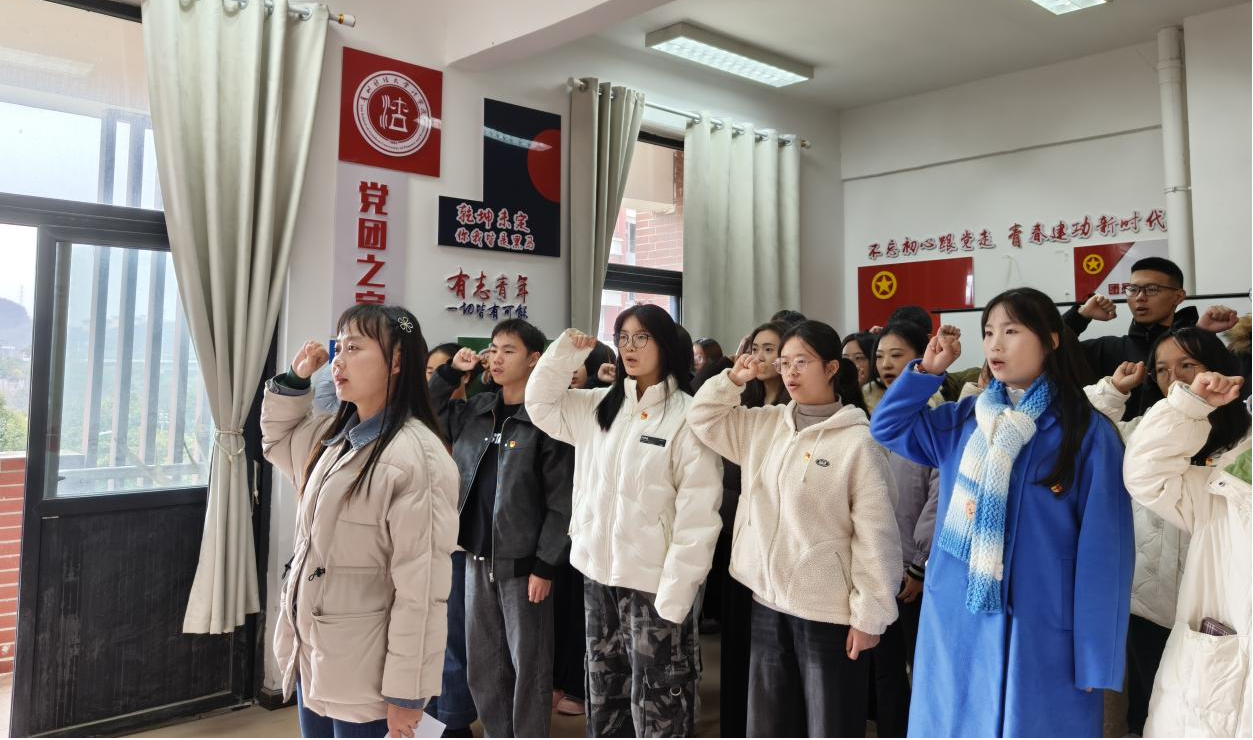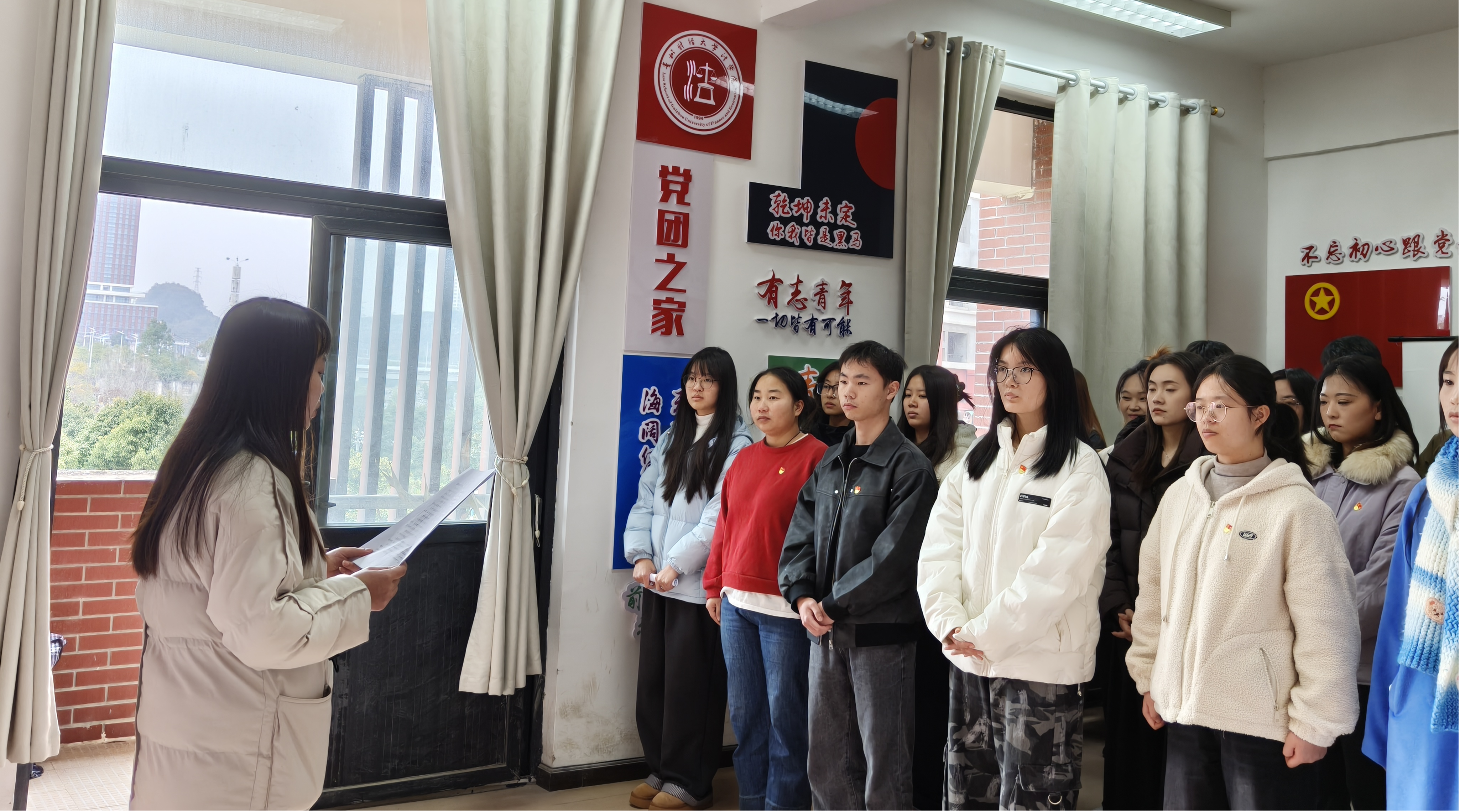 仪式在雄壮的《国际歌》声中正式拉开帷幕。在莫丹洵的带领下,全体新党员整齐肃立,面向鲜红的党旗庄严宣誓。宣誓过程中,新党员们右手握拳过肩,神情庄重,誓言铿锵有力,充分展现了新时代青年党员坚定的政治立场和为共产主义事业奋斗终身的决心。这一庄严时刻,不仅是对党组织的郑重承诺,更是每位新党员政治生命中具有里程碑意义的重要节点。