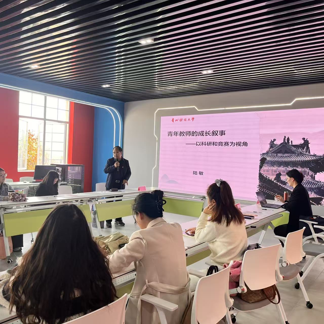 陆敏提出,数智化时代背景下,青年教师开展科研需紧扣数智化赋能与产教融合两大方向,精准对接行业需求;参与竞赛要立足自身专业背景,挖掘特色创新点,打造核心竞争力;日常教学要深度贴合人才培养方案,将科研成果转化为教学资源,实现教学与科研双向赋能。整场分享兼具理论高度与实践温度,为在场青年教师点亮了成长明灯、提供了行动指南,充分展现了我院教师扎实的学术功底与深厚的育人情怀。