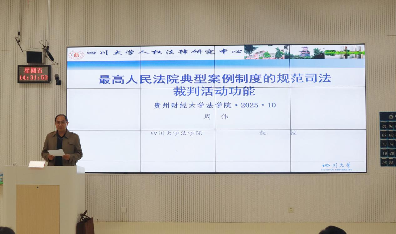 (法学院 张月娇 报道|洪丽华 摄影 )10月24日下午,法学院在乐学楼202举办“贵州财经大学三大论坛——人文论坛”专题讲座,特邀四川大学法学院二级教授、博士生导师周伟作“最高人民法院典型案例制度的规范司法裁判功能”专题报告。法学院党委书记邵新顺、副院长宋昭澜及100余名师生参加,讲座由邵新顺主持。