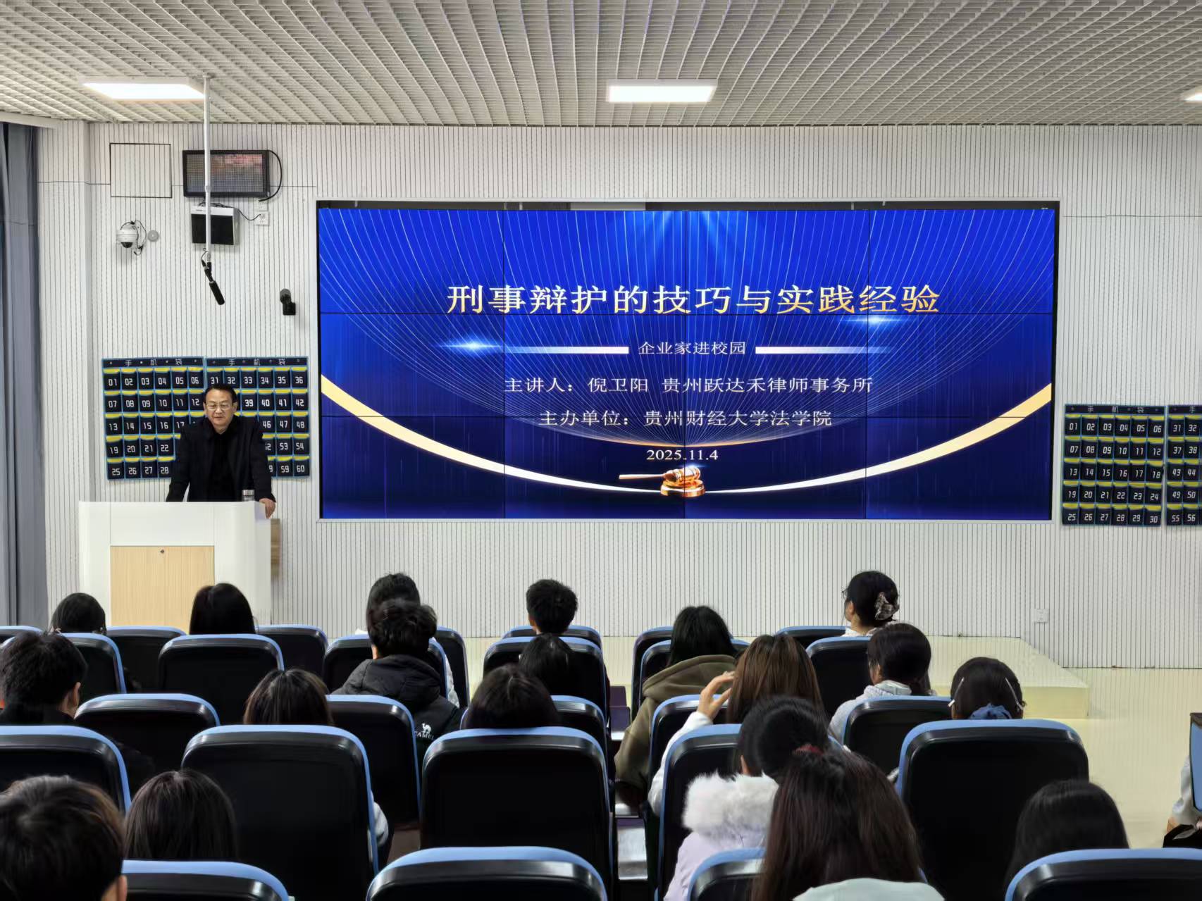 (法学院 何德爽 报道|摄影 李嘉琪)11月4日,由贵州财经大学法学院主办的文化传承与创新之“企业家进校园”活动在进学楼103教室顺利举行。本次讲座邀请贵州省优秀律师、贵州跃达禾律师事务所副主任倪卫阳为主讲人,为全校师生带来一场“刑事辩护的技巧与实践经验”的专题讲座。讲座由法律事务俱乐部主席何德爽主持,全校120余名同学参加。